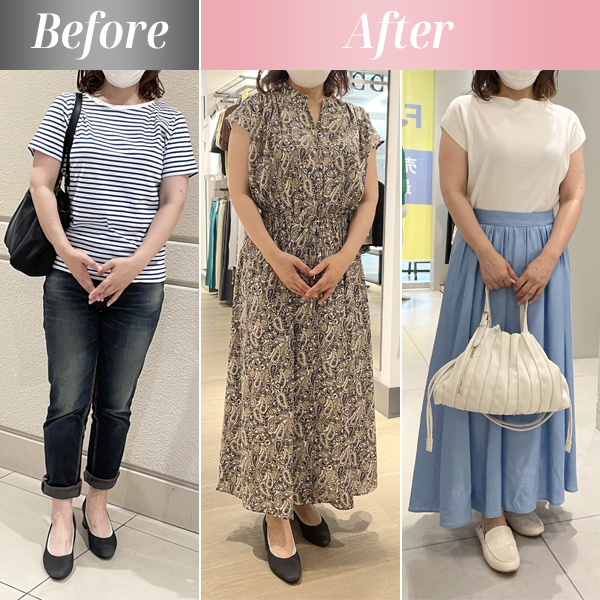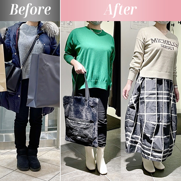 他サロンで骨格ナチュラルと診断され、大きめの服を着崩すようアドバイスされましたが、かえって肩幅や上半身が強調されてしまい、服選びが億劫に。こちらのショッピング同行で本当は憧れていた甘めの服を試したところ、しっくり!選ぶポイントがわかって服選びが楽しみになりました。